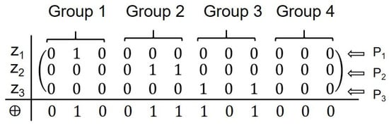 The per-column Hamming weights (column sums) are (0, 1, 0, 0, 1, 1, 1, 0, 1, 0, 0, 0). For every valid column, the sum equals 1; therefore, bidders , and are assigned the identity designations Group 1 Member 2, Group 2 Member 3, and Group 3 Member 5, respectively, satisfying the predefined condition. Thus, the identity code distribution is successful without repetition (see Figure 8).