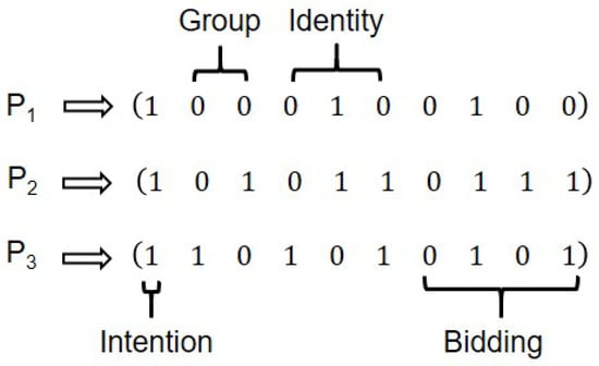 Step 3: According to the established rules, bidders , and perform group encoding operations on particles located at the first and second positions of the sequence, simultaneously executing identity encoding utilizing private vectors at positions 3 through 5.