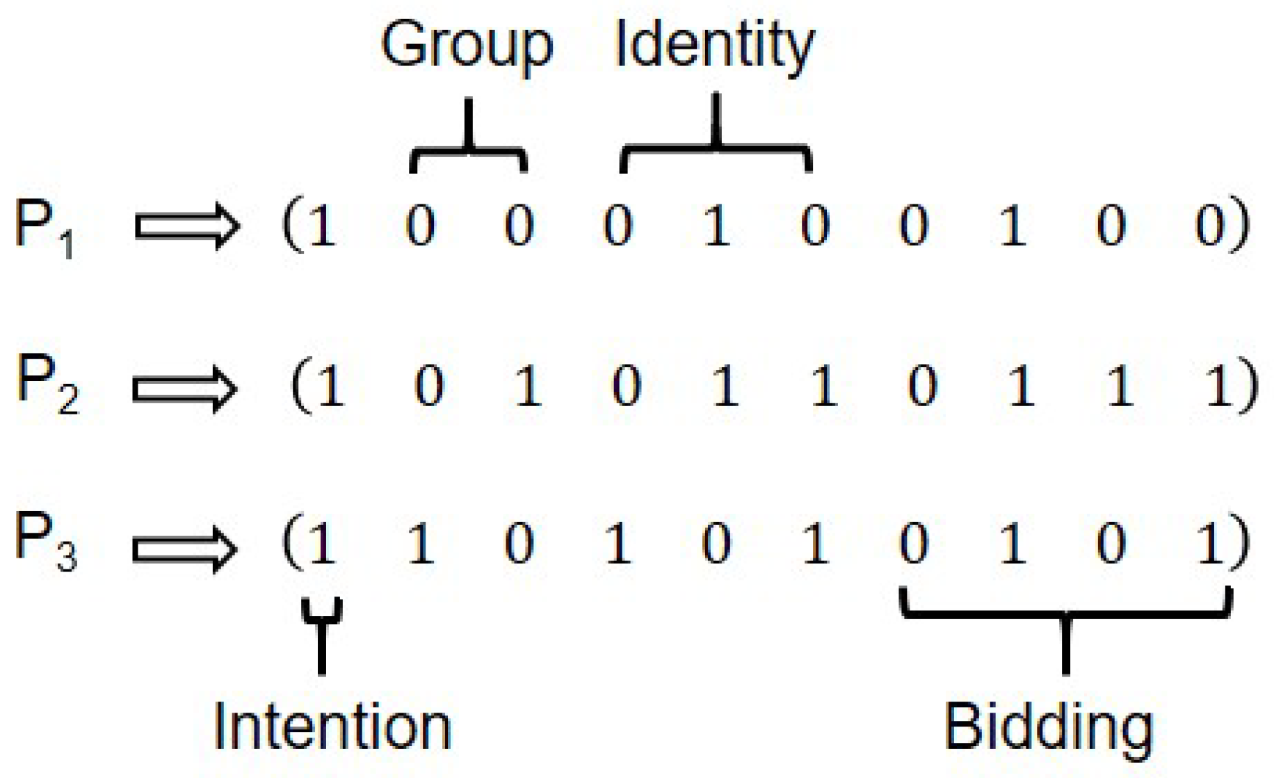 - Liu, W.J.; Wang, H.B.; Yuan, G.L.; Xu, Y.; Chen, Z.Y.; An, X.X.; Ji, F.G.; Gnitou, G.T. Multiparty quantum sealed-bid auction using single photons as message carrier. Quantum Inf. Process. 2016, 15, 869–879. [Google Scholar] [CrossRef]