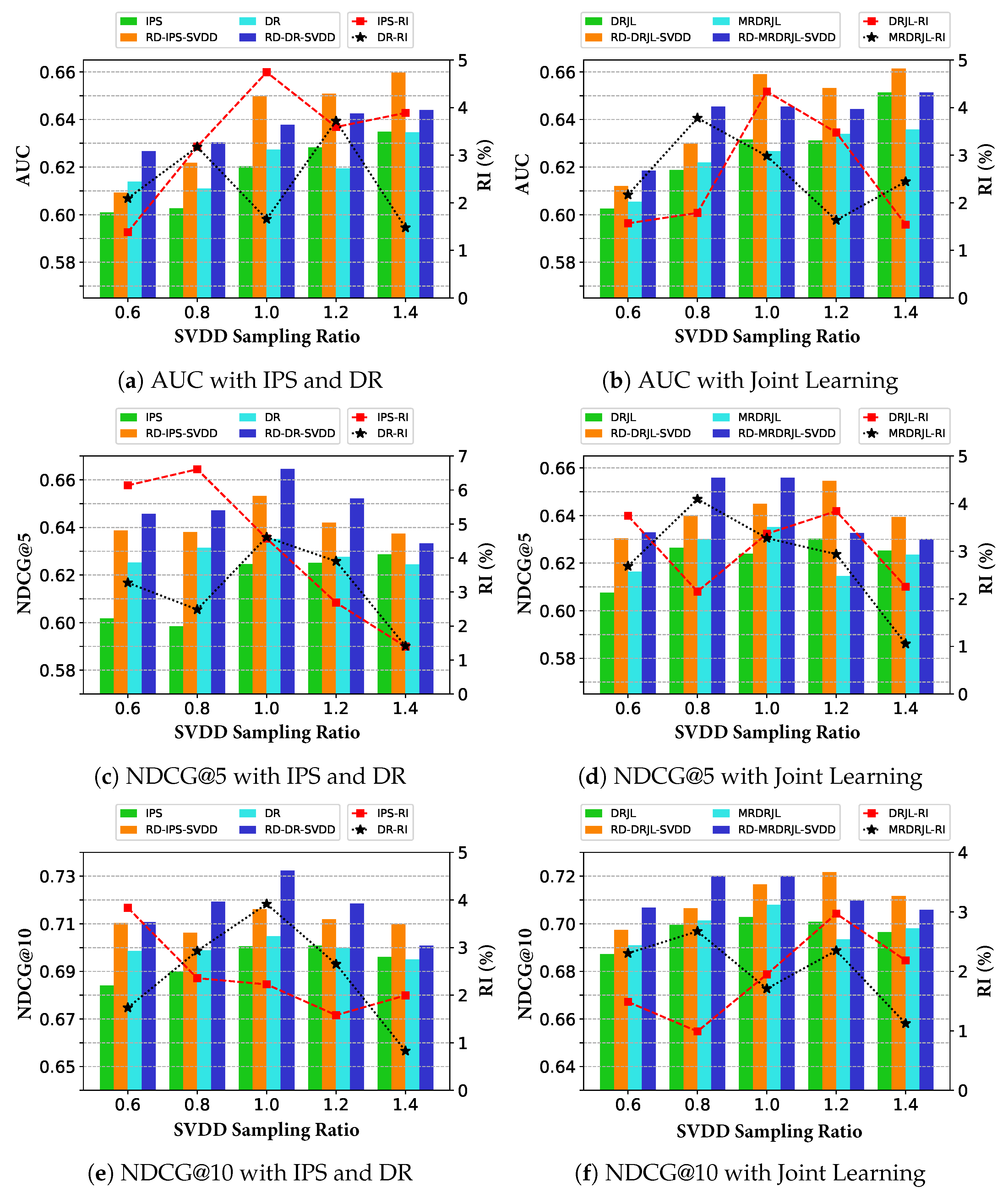 - Effect of SVDD Sampling Ratio in the First Stage. In the first stage, SVDD can provide more reliable imputations for positive treatment, leading to more accurate estimation of propensities and relevance predictions. Figure 3 demonstrates the effect of the various debiasing methods on AUC, NDCG@5, and NDCG@10 at different sample ratios of positive treatment imputations. Remarkably, the proposed method outperforms significantly over the baseline with all SVDD sampling ratios. In addition, predictive performance reaches an optimal for proper positive sampling ratios between 0.8 and 1.2. This is explained by the fact that too many or too few imputations of positive treatment can cause data imbalance, and the positive imputations by the SVDD method result in lower confidence as the number of imputations increases.