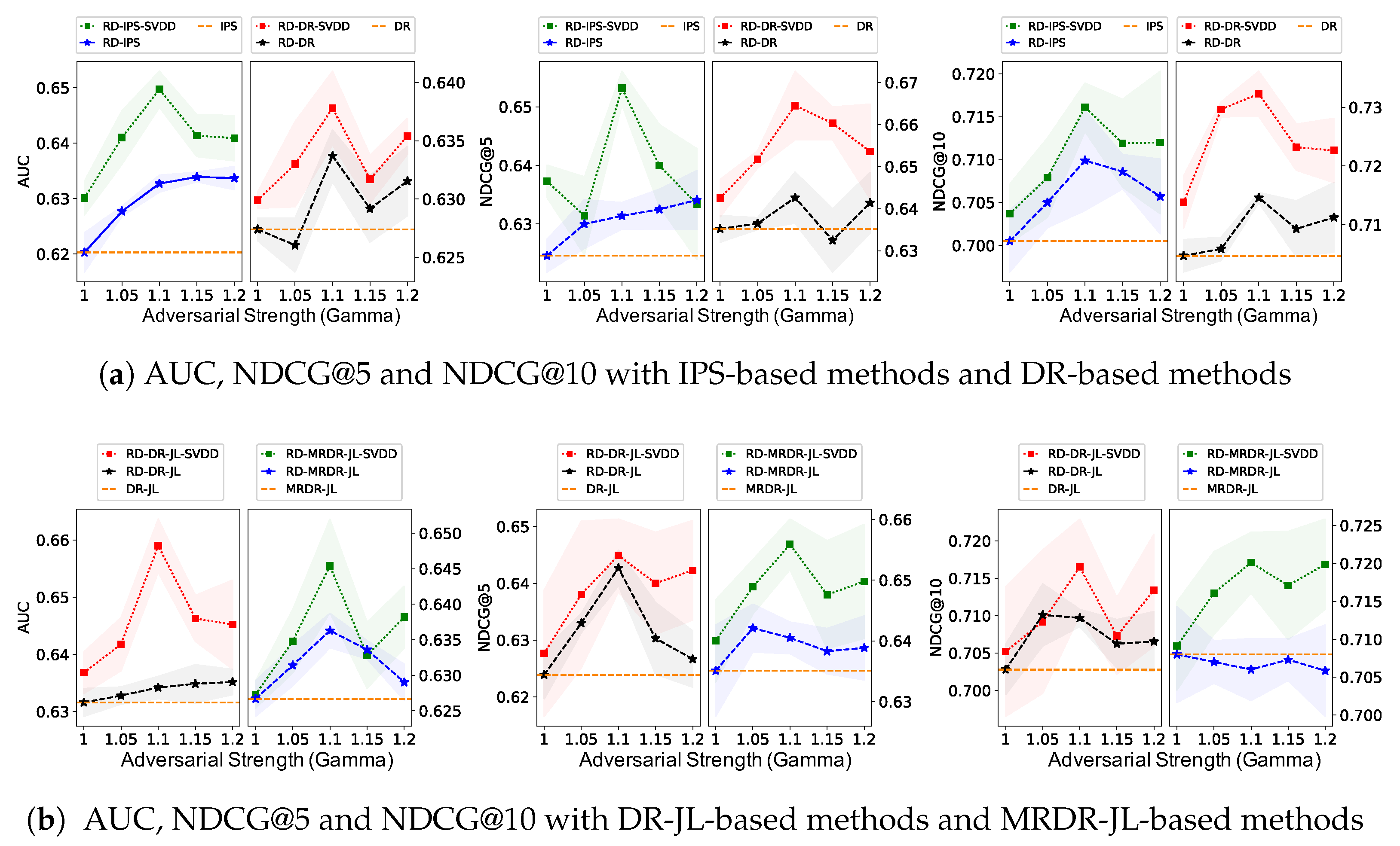 - Experimental protocols and details. Following the previous studies [22,60], MSE, AUC, NDCG@5 and NDCG@10 are used as our evaluation metrics. All experiments are implemented on PyTorch v2.6.0 with Adam as the optimizer (for all experiments, we use GeForce RTX 2060 as the computing resource). To mitigate overfitting, we employ L2 regularization via weight decay and early stopping during training, which is terminated when the relative loss decrease falls below a tolerance threshold for 5 consecutive epochs. We tune the weight decay in and the learning rate in . In addition, we tune the sample ratio between the imputed negative and positive samples in in RQ3 and set it to 1.0 for other RQs. For the RD-based methods, we tune the adversarial strength gamma in in RQ4 and set it to 1.1 for other RQs. We set the batch size to 128 for Coat, 2048 for Yahoo! R3 and KuaiRec, and use the default parameter values in the SVDD function in scikit-learn v1.3.0 package for the SVDD-based methods on both datasets.