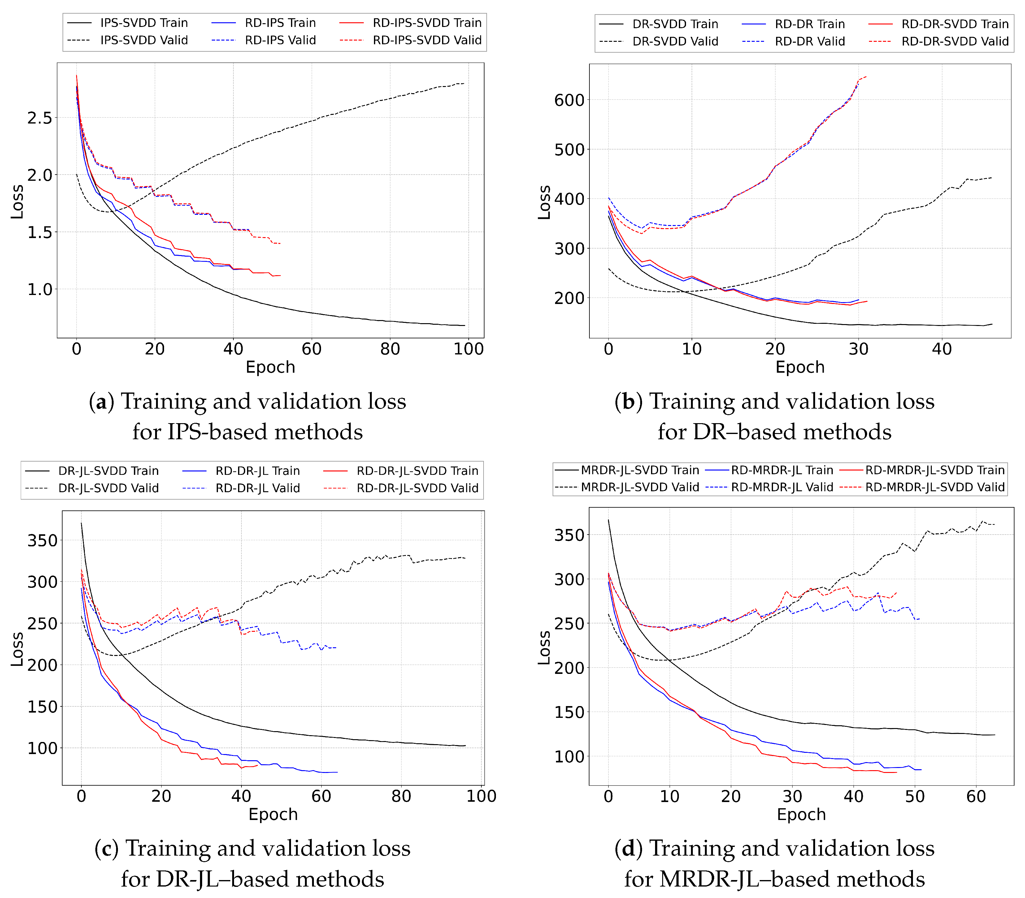 - Overfitting Analysis. We evaluate whether the proposed two-phase debiasing framework leads to overfitting by tracking the IPS-weighted training and validation losses across epochs. The trajectories in Figure 5 show that SVDD-only variants within the IPS, DR-JL, and MRDR-JL families converge slowly and display clear upward trends in validation loss, reflecting that treatment imputation alone increases data coverage but does not correct the confounding structure of the logged data, making the models sensitive to pseudo-negative noise. Adding the RD phase mitigates this issue: RD-only variants converge more quickly and exhibit noticeably reduced overfitting, which is consistent with RD’s ability to regulate propensity adjustments and limit the influence of unmeasured confounders. The full two-phase method combining SVDD and RD further stabilizes the trajectories, reaching convergence more rapidly and maintaining lower validation losses near convergence.