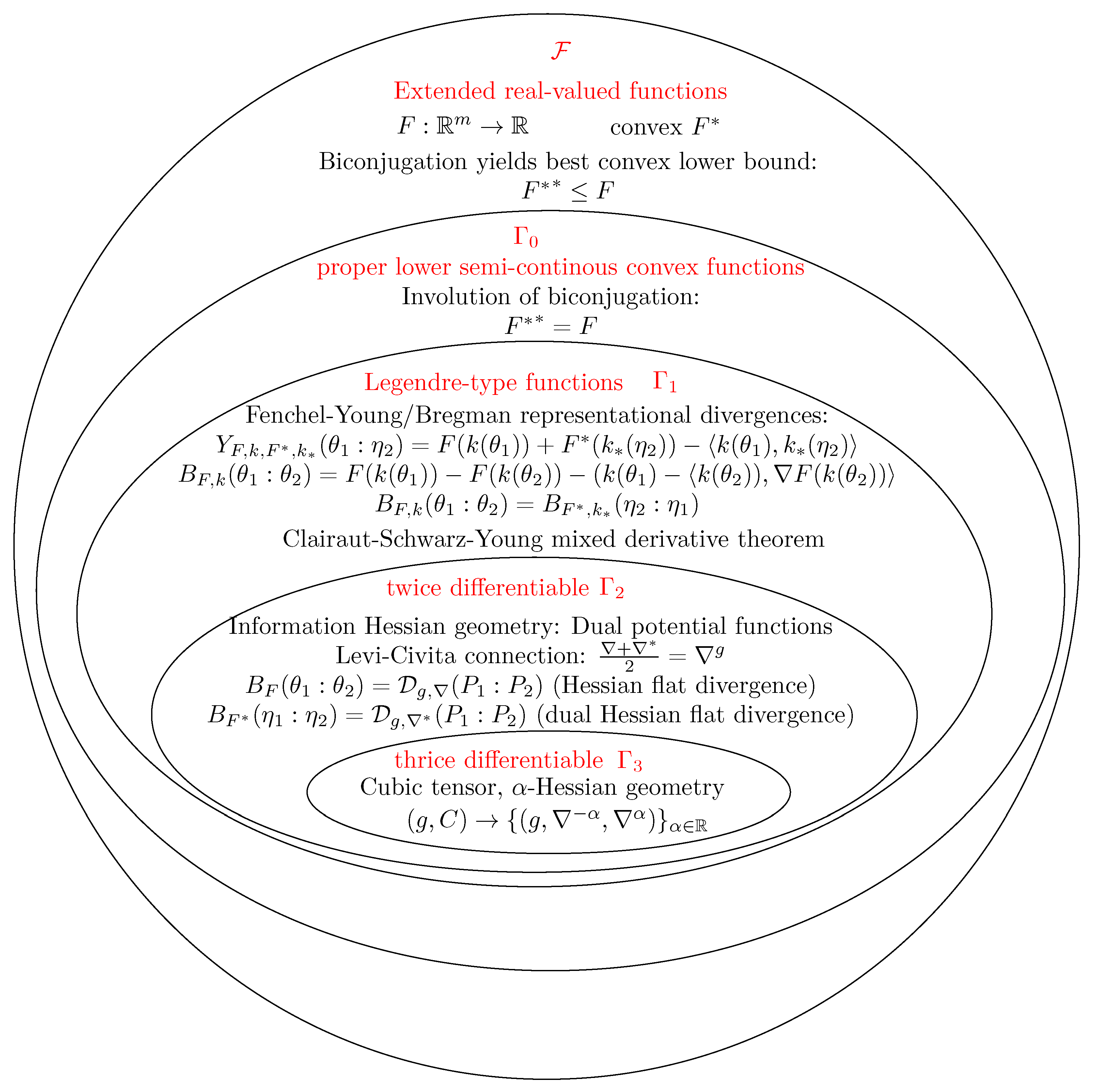 Figure 1. The ordinary Legendre transform for various classes of functions: relationships with Fenchel–Young and Bregman divergences, dually flat Hessian divergence, and α geometry in information geometry.