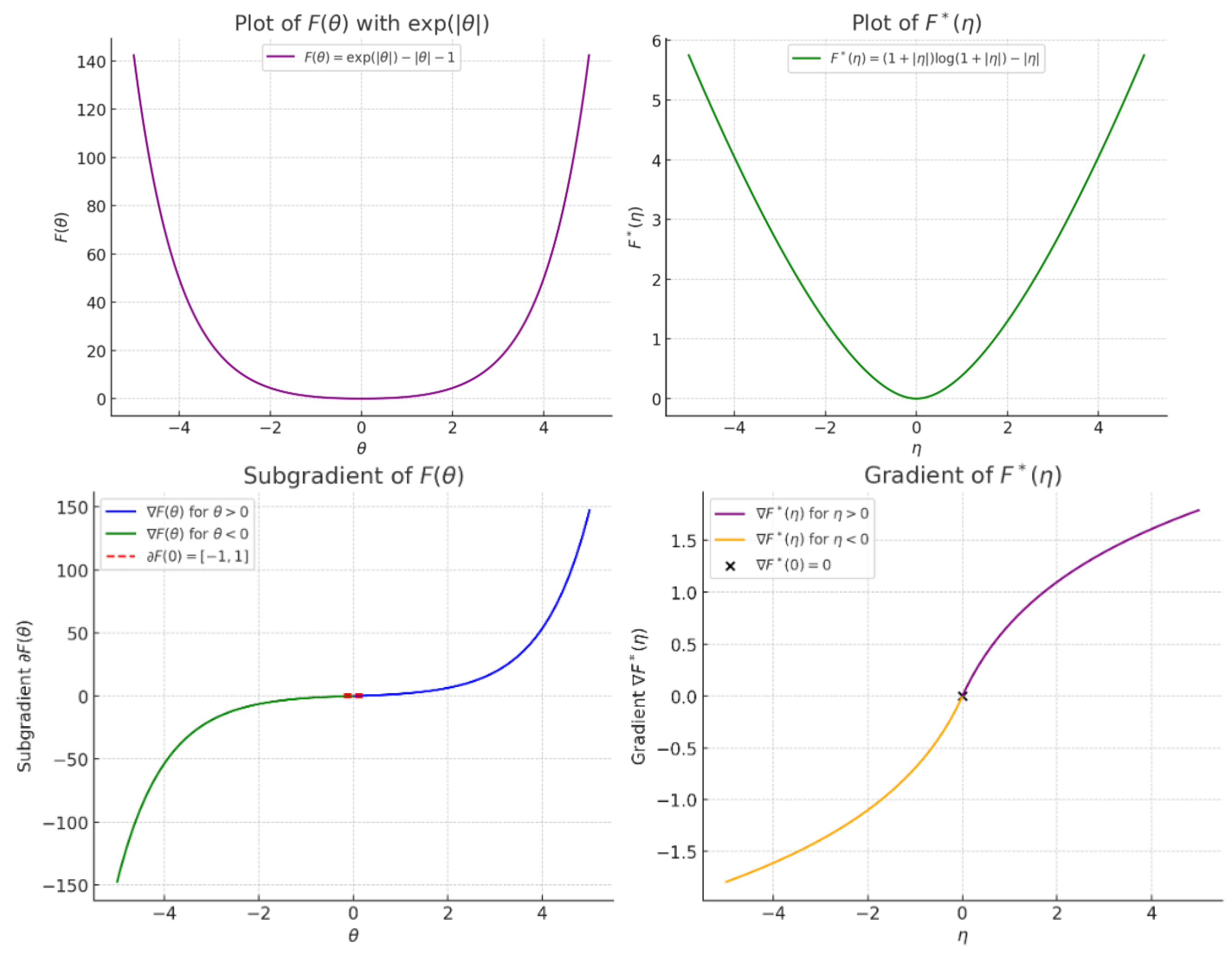 Figure A1. A pair ( F ( θ ) , F * ( η ) ) of conjugate functions (top) with their subgradients plotted (bottom). The function F ( θ ) is not differentiable at θ = 0 and thus admits a subgradient F ( 0 ) at θ = 0 . The function F * ( η ) is differentiable everywhere, and when θ 0 , we have F * = ( F ) 1 , visualized by rotating the x y axis 90 degrees).