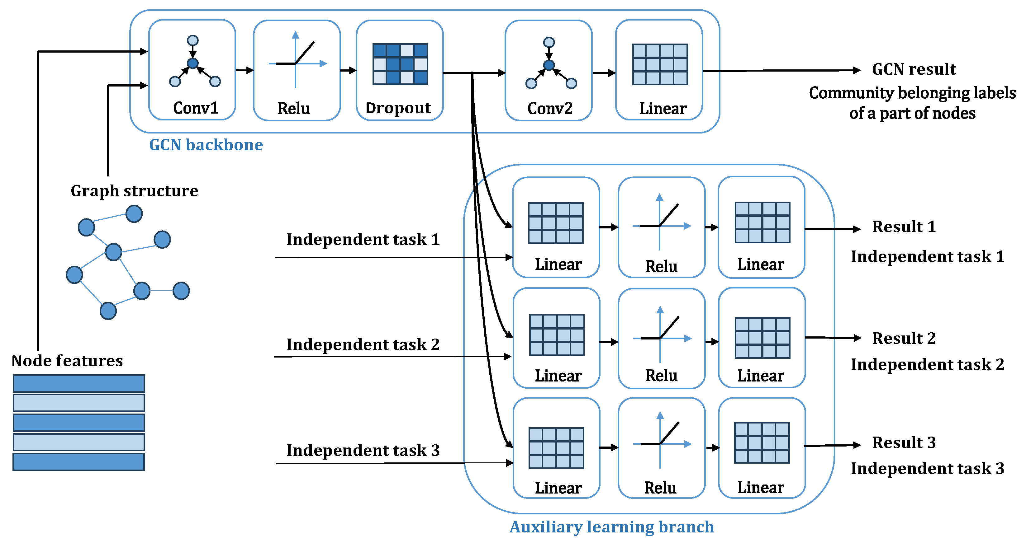 The auxiliary learning branch proposed in this paper is applicable to a typical inductive learning model—GraphSAGE with neighbor sampling. This model is particularly well-suited for graphs with incomplete and dynamic nodes, as it operates by adopting neighbor nodes and loading graph subsets in batches.