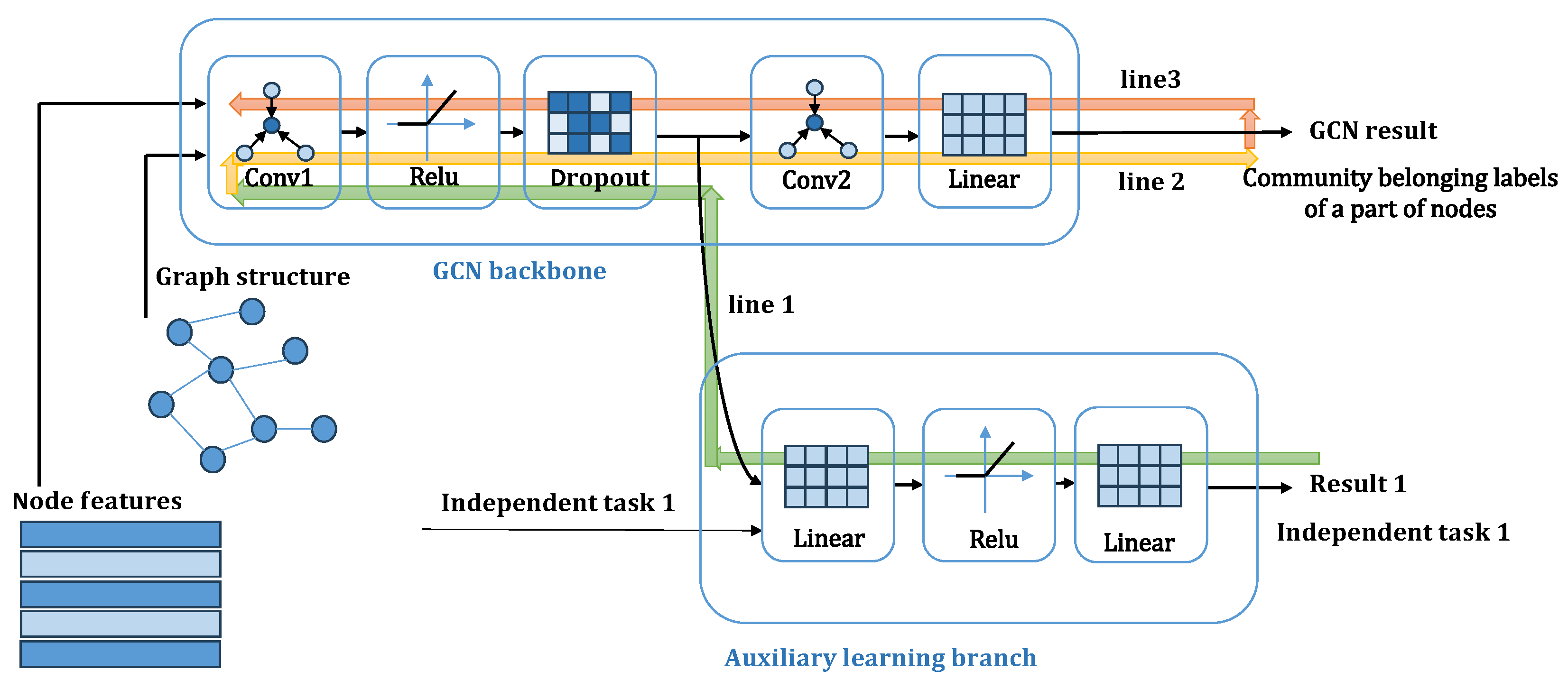 The auxiliary training branch proposed in this paper is currently only used for semi-supervised community detection tasks, while most of the non-deep learning community detection algorithms mentioned above are unsupervised learning algorithms. Since the semi-supervised algorithm has more labels for some nodes than the unsupervised algorithm, the increase of information can naturally bring better results, so the experiment in this paper does not compare with the unsupervised learning algorithm.