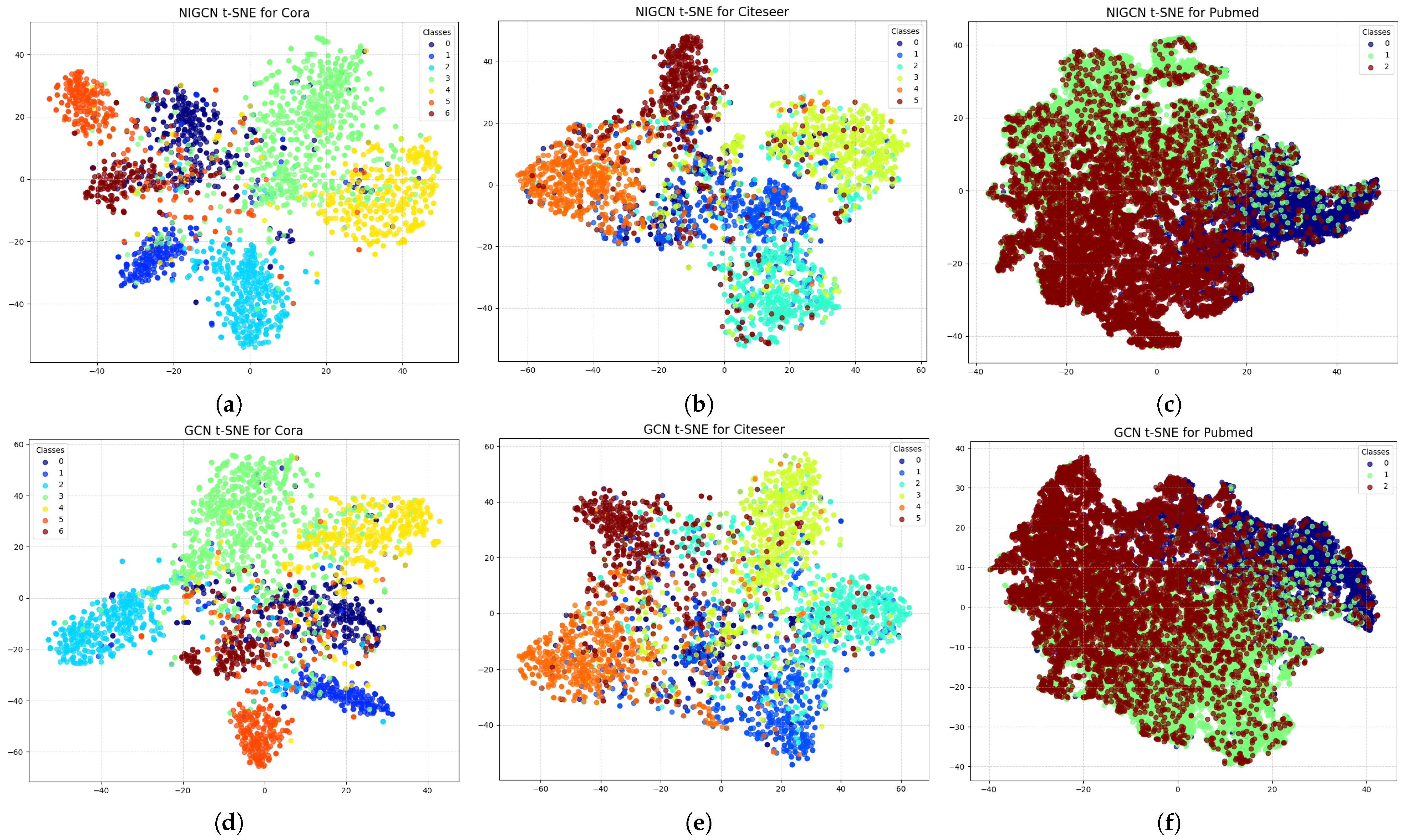 To visually demonstrate the effect of our proposed gradient modulation mechanism, we visualize the node embeddings from an intermediate layer of the NIGCN model in