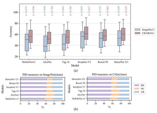 Six convolutional neural networks with diverse architectures are selected for analysis of information interaction characteristics: MobileNet V2 [27], AlexNet [28], VGG 16 [29], Inception V3 [30], ResNet 50 [31], and DenseNet 121 [32]. All models are initialized using pretrained weights provided in PyTorch 2.9.1 and are not fine-tuned on any corrupted data. Each model is evaluated in all types and severity levels, its performance and PID characteristics are analyzed accordingly. All experiments are conducted on a multi-core CPU platform equipped with dual Intel Xeon Gold-class processors. Under this setup, the PID analysis for a single model and dataset takes close to two hours.