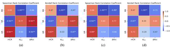 To further assess the statistical validity of the trends observed in the previous section, a non-parametric rank correlation analysis is conducted to quantify the relationship between PID measures and model robustness. Unlike correlation metrics that rely on linear assumptions, Spearman’s and Kendall’s are better suited for for capturing monotonic relationships, particularly when dealing with nonlinearity and ordinal consistency. Accordingly, this study applies both and to systematically assess the rank correlation between three PID measures (RR, SR, UR) and the three robustness measures (, , ). This analysis aims to explore the potential of these metrics as predictors for model robustness.