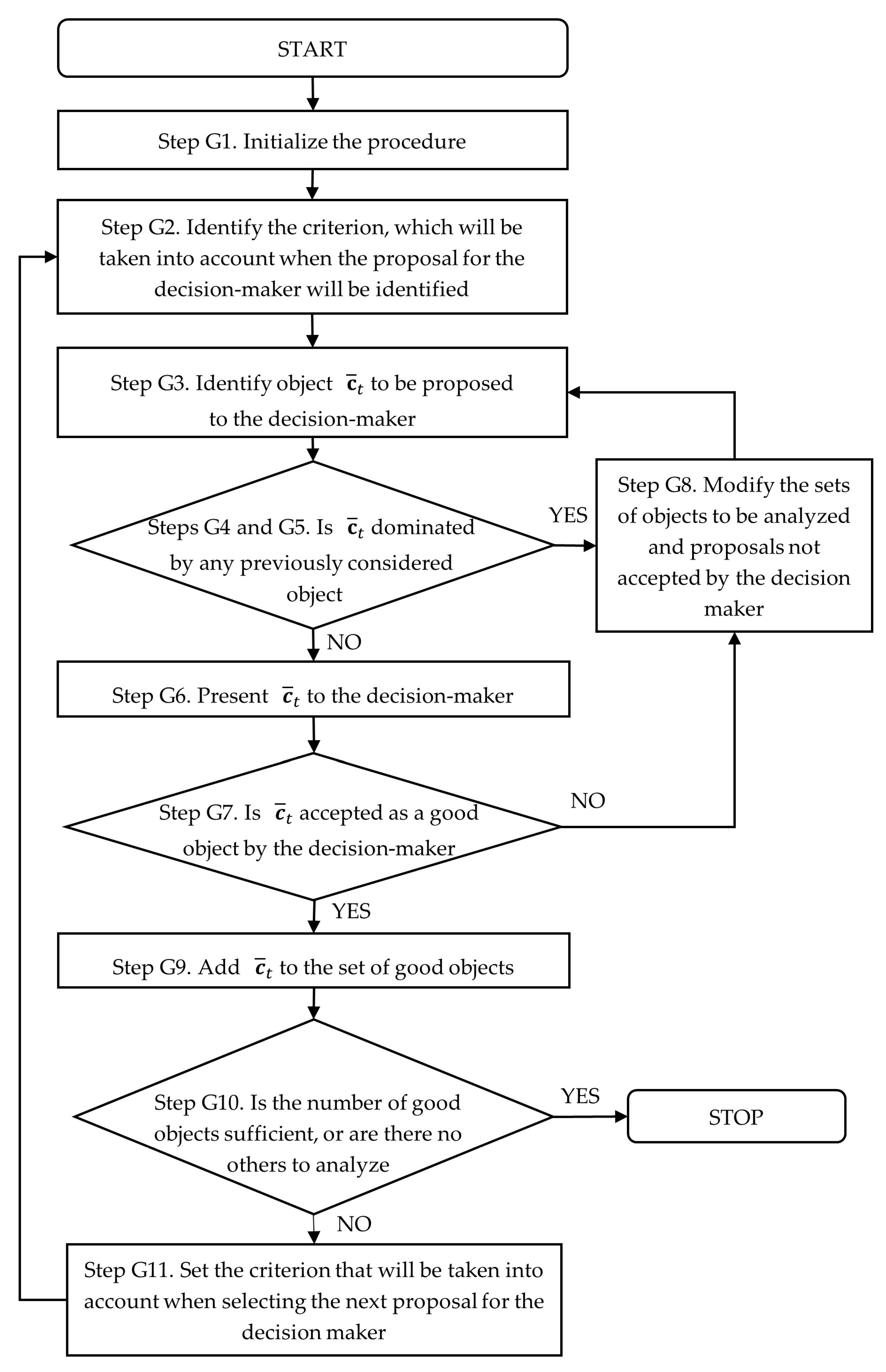 - Step G5: As was neither dominated by objects from (), nor by objects from (, the procedure proceeded to Step G6.
