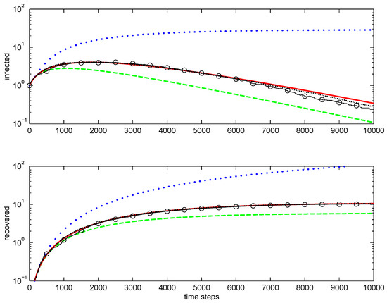Modelling epidemic in one-dimensional case: total infected (top figure) and recovered (bottom figure). Lines: , first-order closure; – – – –, second-order direct decoupling closure; —, second-order conditional closure; o—o—o, Monte Carlo ensemble averaging over 100 realisations; , Monte Carlo ensemble averaging over 1000 realisations. Simulation parameters: .