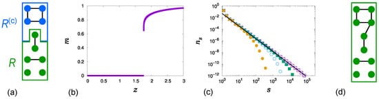 (a) An illustration of the division into two subsets, R (the lower 6 nodes marked in green) and (the upper 4 nodes marked in blue), is provided for and . Note that all 6 nodes are assigned to R even though , since R is defined to contain every node in the marginal cluster. (b) Plot of m for . (c) Plot of for at , and for successively larger values of , shown from right to left. The solid line has slope . (d) In this case, all 10 nodes are included in R because the largest cluster exceeds in size.