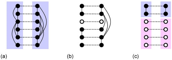The derivation of the relations , and is summarized as follows. At , numerical results show that , implying that the largest cluster is and its size exceeds . Consequently, R contains all nodes, as illustrated in Figure 1d. Therefore, for , the HR model follows ER-type link addition, in which links are added between two randomly selected nodes.
