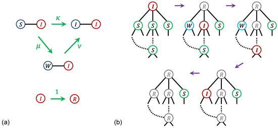 The dynamical rules of the model are defined as follows: Consider a network with a mean degree z. At time , one node is initialized in state I, while all remaining nodes are in state S. At each subsequent time t, the following procedure is applied to every node that is in state I at that time. For each such infected node, the states of all of its neighbors are updated for the next time step according to these rules. If a neighbor is in state S, it changes to state I with probability or to state W with probability . If a neighbor is in state W, it transitions to state I with probability . These neighbor update rules are depicted in Figure 4a. To encode that weakened nodes are more susceptible to infection, the model imposes . As the system progresses from t to , all nodes that were in state I at time t transition to state R. This update procedure for each time step is iterated until the system reaches an absorbent configuration in which no infected nodes remain in the network.
