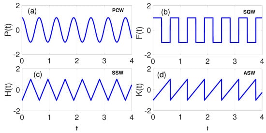 In this study, four distinct excitation types were examined: the periodic cosine waveform (PCW), ; the square waveform (SQW), ; the symmetric sawtooth waveform (SSW), ; and the asymmetric sawtooth waveform (ASW), , respectively, expressed as follows: