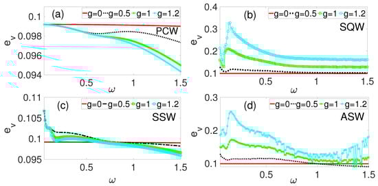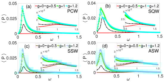 Average power harvesting, as a function of for some values of phase modulation amplitude, g. (a) Cosine periodic waveform (PCW), (b) square waveform (SQW), (c) symmetric sawtooth waveform (SSW), and (d) asymmetric sawtooth waveform (ASW).