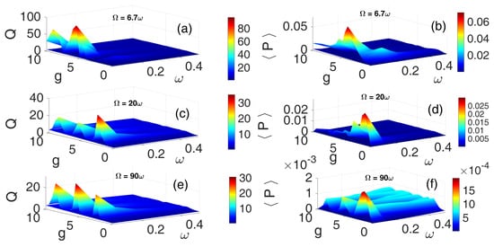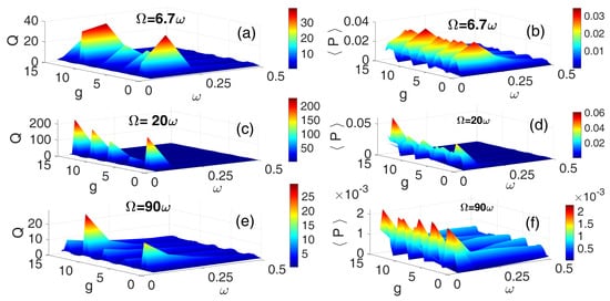 [Color Online] The dependence of the response amplitude Q and corresponding average power on the low-frequency and the amplitude g of the HF SQW excitation for three different values of frequency ratios: (a,b), (c,d), and (e,f). and .