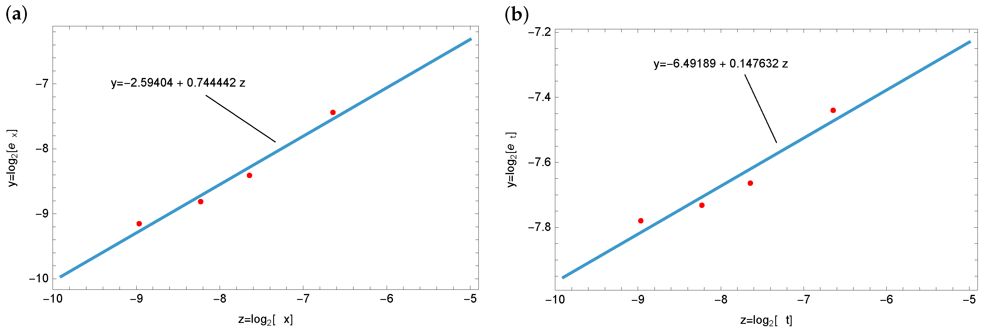 Figure 6 presents an empirical assessment of the convergence behavior. For the spatial variable, an approximate convergence rate of 0.74 is observed, whereas for the temporal variable, the estimated rate is close to 0.14. The theoretical orders are expected to be valid only for sufficiently small step sizes