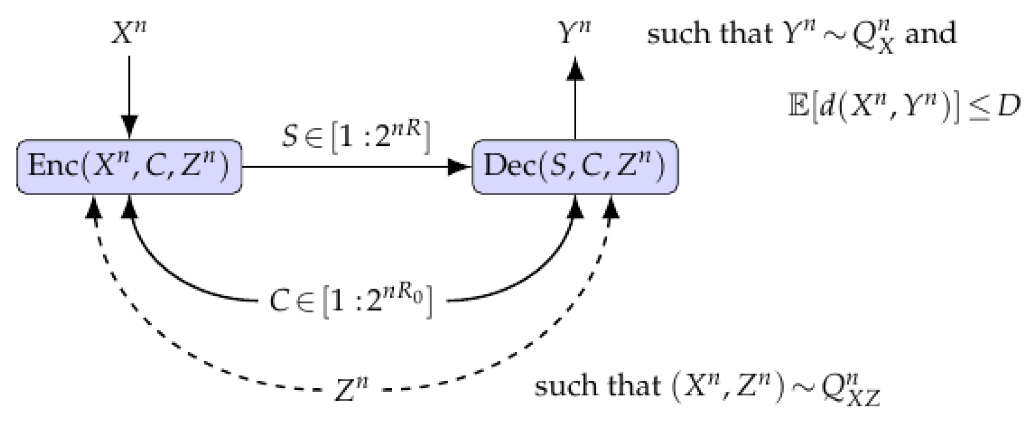 - Cuff, P. Distributed Channel Synthesis. IEEE Trans. Inf. Theory (T-IT) 2013, 59, 7071–7096. [Google Scholar] [CrossRef]