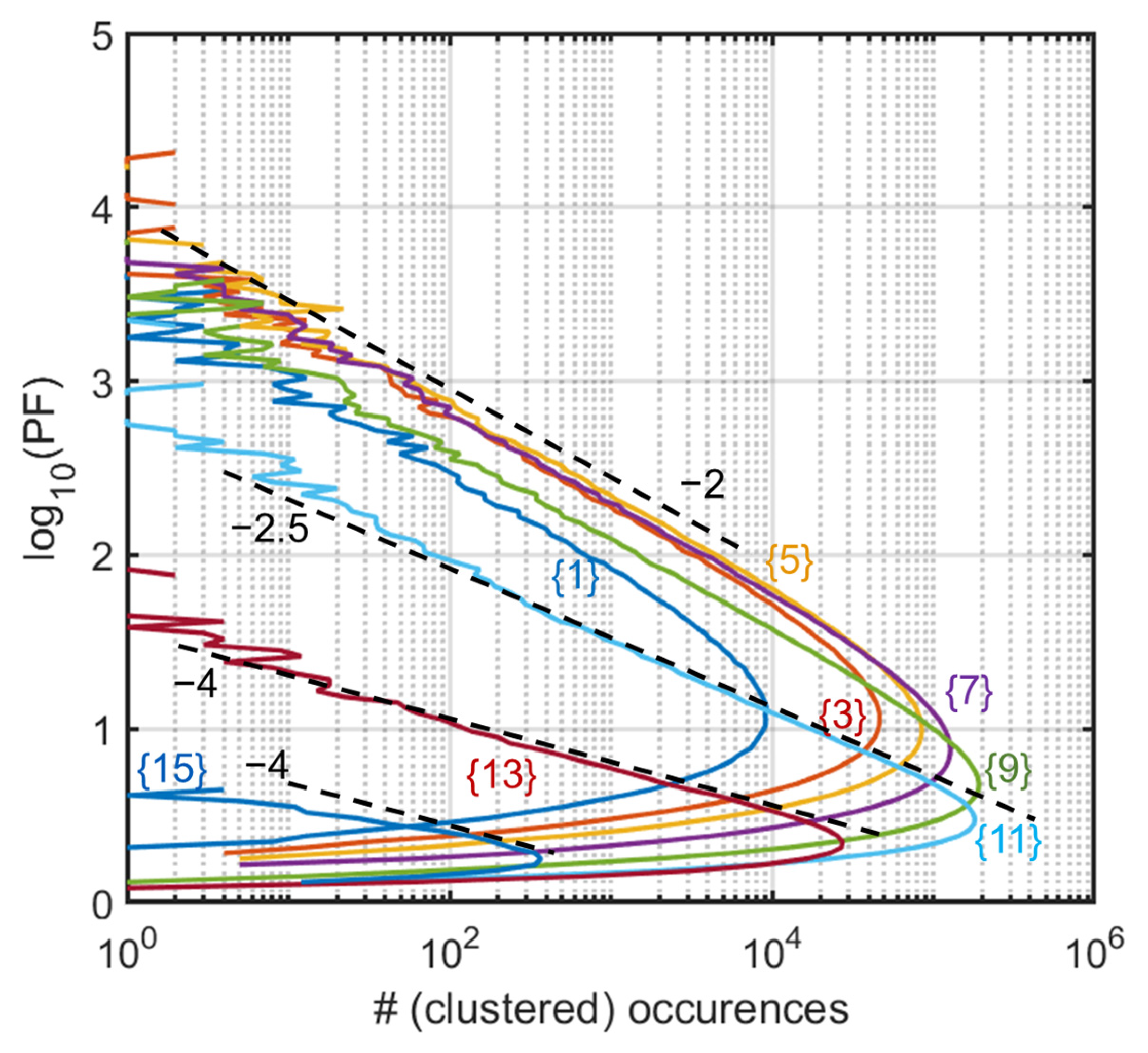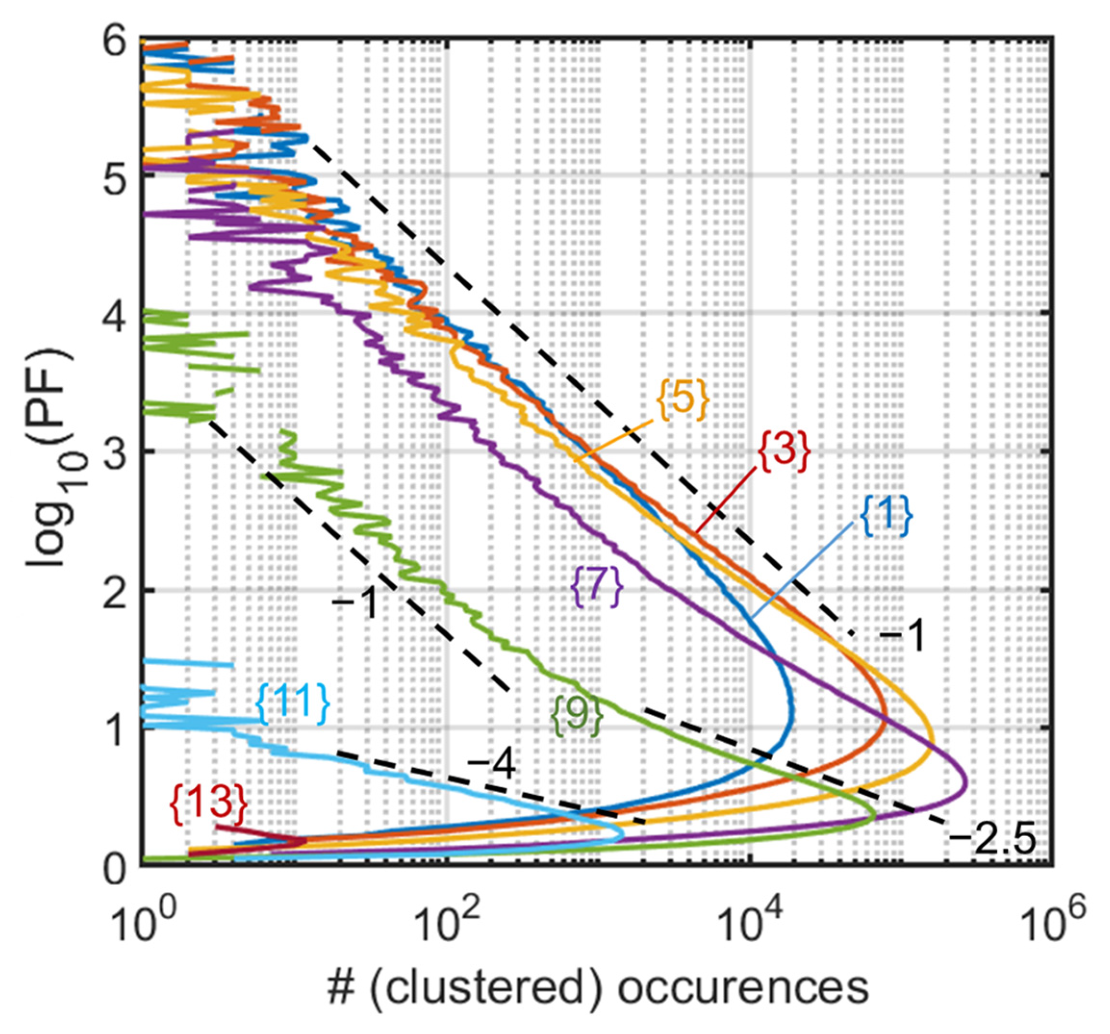 Figure 2, we can thus analyze the trend of the high-PF tail, associated mainly to the −1 slope. Larger slopes such as −2.5 and −4 are seen for the larger