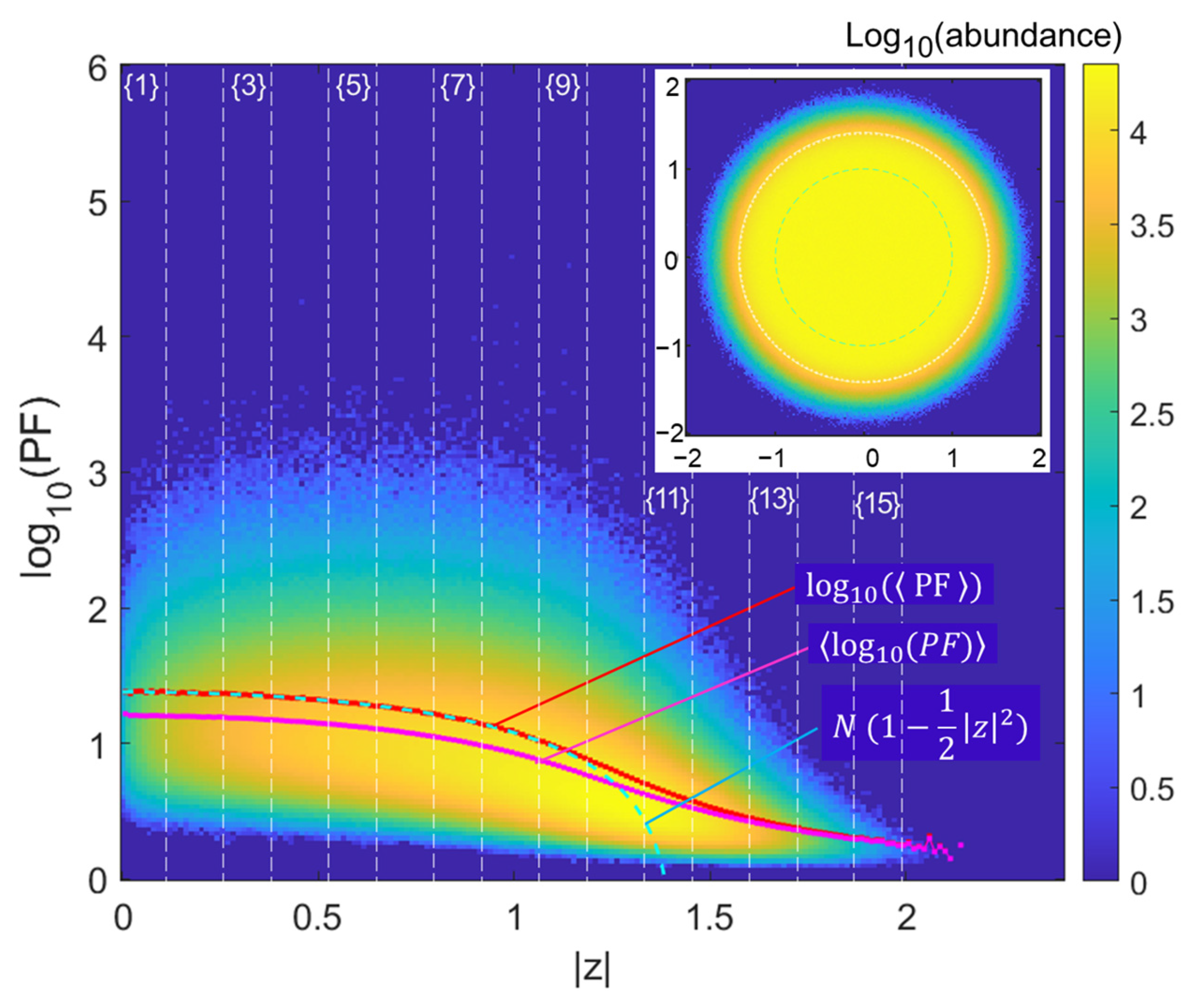 Obviously, the distribution is now much gentler with much less very large extreme values of PF. Only scarce PF occurrences exceed . Accordingly, the ratio between the PF mean and the log-mean, (the cloud apparent mean) is now about 1.16 at lower values (peaking at 1.18 for , and trending to 1 at larger ). There is now a very good agreement with the law, up to , i.e., when the asymptotic circle radius is approached within , the typical scaling of extreme eigenvalue tail effects adapted to our context.