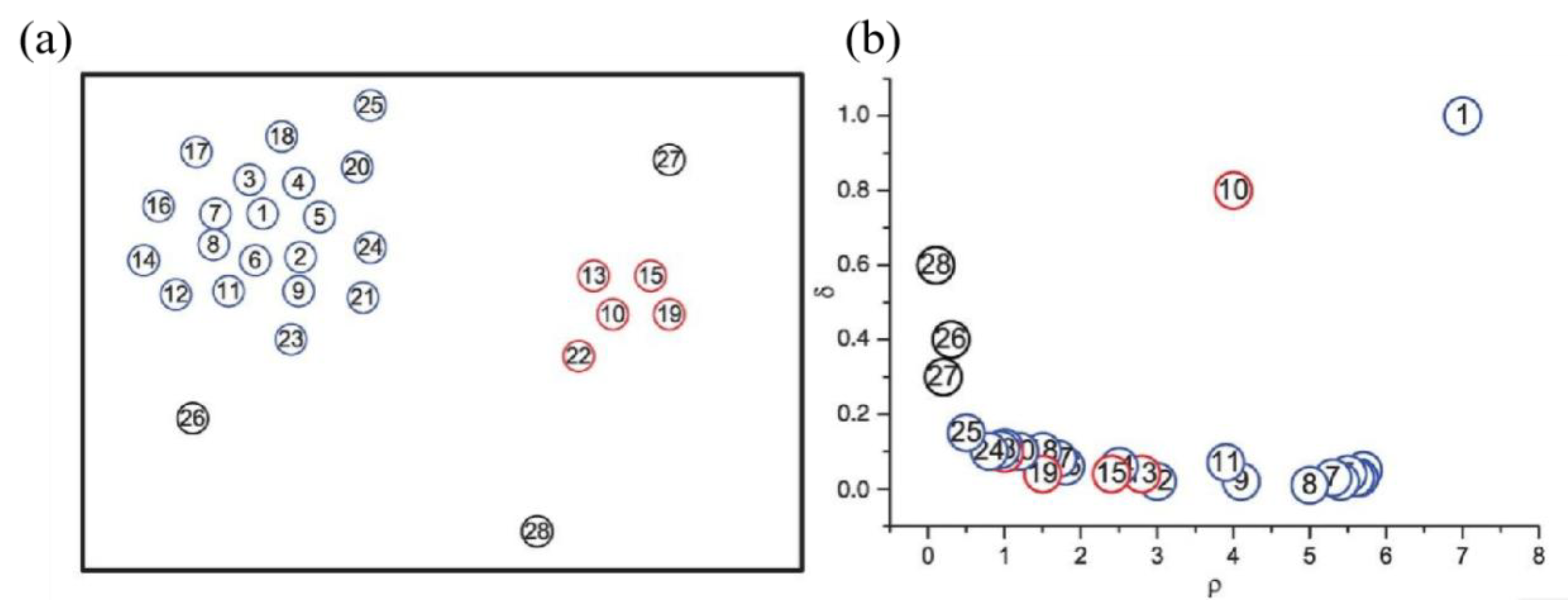 Figure 2b. These points appear in the upper-right region of the decision graph, representing optimal cluster center candidates. Conversely, points 26–28 demonstrate an inverse pattern with relatively large