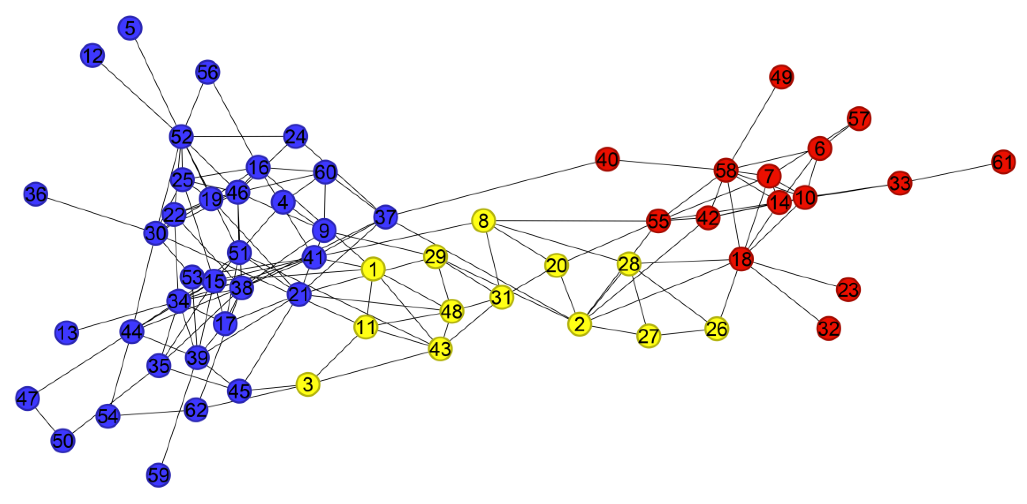 Figure 5 visualizes the partitioning result of D-means on the Karate network. Only one node (Node 3) is misclassified, which can be attributed to its position at the community boundary and its strong connections to nodes in both communities, leading to ambiguity in community assignment.