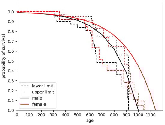 The plot showing the prediction of the length of mice’ life. The dashed and dotted lines correspond to the data from reference [13]. The solid lines are our approximations. The color of particular line corresponds to the gender of mice.