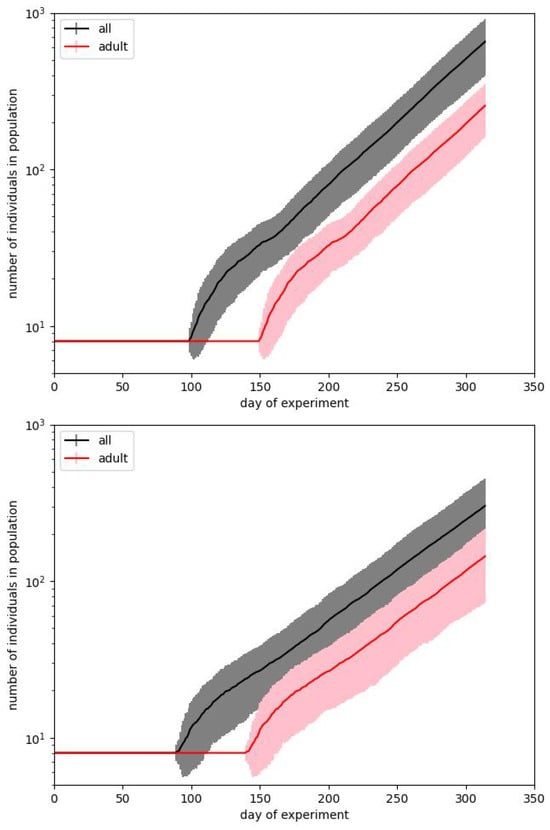 Figure 3 corresponds to the first case. For every set of parameters, we make 100 simulation runs and average values for particular times. The length of the bars corresponds to the standard deviations obtained for these runs. We show the curves for the total number of individuals in a population and for the number of adults. Such a way of presentation is related to the fact that it is reported that on the 315th day, the whole population counted 620 mice, but there were just 150 adults among them. It turns out that although it is straightforward to reproduce the exponential dependence of one of these numbers, it is pretty hard to reproduce both of them.