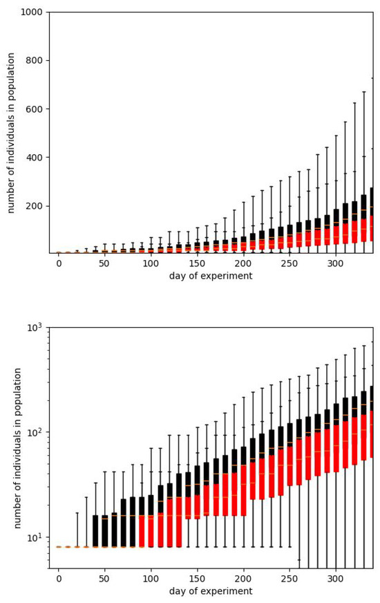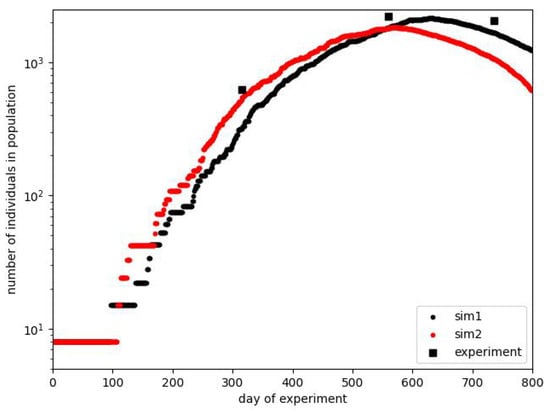 As mentioned earlier, the course of the experiment was a particular one. It took much work to reproduce it with very high accuracy. In Figure 6, we show two courses close to the experimental one. Intentionally, we do not show the results after the 800th day because different manipulations, like the removal of part of the population, took place during this time. The crucial thing is that we can reproduce the approximate shape of the population curve. The maximum position is approximately correct, but we are unsure whether the 2200 individuals on the 560th day is the exact measurement or some estimation. The measurements of population size were not performed every day. The effect that can be under more detailed consideration is the width of the maximum plateau, which can be extended more.