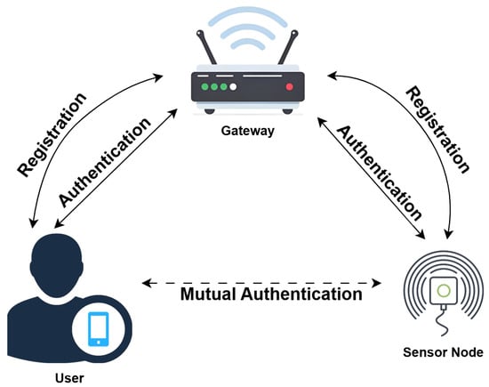 The user is the ultimate requestor of data, initiating data access requests to sensor nodes with devices such as mobile terminals. Sensor nodes undertake the collection of environmental data and are usually constrained by resources; in particular, limited computation capability, memory capacity, and energy availability. The gateway node is the system’s safe central core of the system. Having processing power far superior to sensor nodes, the gateway node takes care of the registration of both users and sensor nodes. In addition, it helps the user and sensor node achieve mutual authentication and secure communication.
