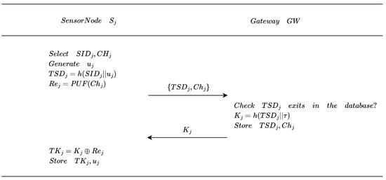 The sensor node selects the identity and a challenge , generates a random number , and computes . Using the PUF function, it generates the response . Subsequently, transmits and to the gateway . checks whether duplicates any record in the database. If no duplicates are found, it computes , stores and , and transmits back to . Upon receiving , calculates and stores and . The process of sensor node registration is shown in Figure 3.