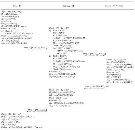 - The user selects the identity and the password , and collects biometric information . selects a random number , and computes , , , and , then transmits the registration information to the gateway node via a secure channel. The secure channel during the registration phase can be realized through practical means, such as an out-of-band channel, pre-shared credentials during device provisioning, or physical access at deployment time.