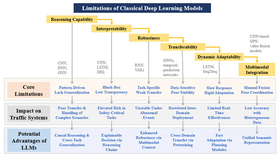 While traditional Deep Learning (DL) models have achieved notable success in specific traffic tasks, such as perception, short-term prediction, and pattern recognition, they exhibit inherent limitations in cross-modal semantic understanding, long-horizon causal reasoning, and flexible decision-making in open and evolving environments [11,12,13]. These limitations are closely related to their restricted ability to represent high-level semantic information and to explicitly manage uncertainty across heterogeneous data sources. In contrast, LLMs offer a unified probabilistic framework for semantic modeling and reasoning, opening new opportunities to address these challenges from an information-processing perspective.
