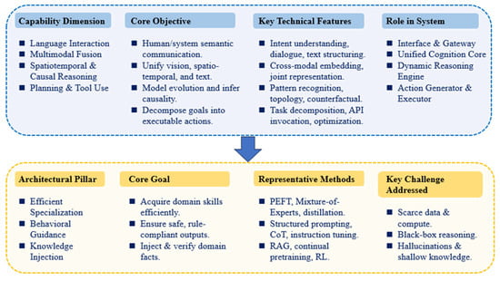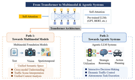 Pre-trained language models such as Generative Pre-trained Transformer (GPT) and Bidirectional Encoder Representations from Transformers (BERT) acquire strong probabilistic priors for language understanding and generation through self-supervised learning on massive text corpora, using objectives such as Masked Language Modeling (MLM) and next-token prediction [29,33,36,37]. These objectives correspond to minimizing conditional entropy under incomplete information, thereby enabling models to learn rich semantic representations and uncertainty-aware inference mechanisms. However, purely text-based models remain insufficient to address the intrinsic multimodality and interactive decision requirements of traffic systems. Current technological developments can be broadly characterized by two major evolutionary directions, as illustrated in Figure 2.