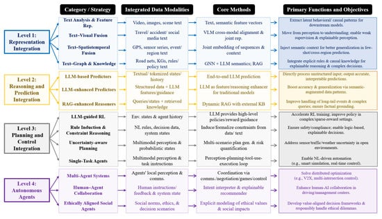To address these challenges, this paper adopts a four-level LLM integration perspective (representation, reasoning and prediction, planning and control, and autonomous agent integration) grounded in the depth of technical integration and the evolution of system autonomy. This hierarchy reflects different stages of information encoding, semantic compression, uncertainty transfer, and information–decision coupling within intelligent traffic systems. Conducting the literature review from this perspective offers three key advantages. First, it enables studies across diverse traffic scenarios to be compared in terms of representation strategies, reasoning mechanisms, and decision-making patterns, facilitating the identification of common technical structures and capability dependencies [2,15,22,28]. Second, the proposed classification implies an ascending capability progression in semantic reasoning and uncertainty handling, which allows for a discussion of which LLM capabilities have reached relative maturity in traffic applications and which remain constrained by fundamental limitations [25,26,27]. Third, by examining different levels of technical integration, it becomes possible to assess in which traffic tasks LLMs demonstrate clear advantages and in which contexts they remain unable to surpass traditional physics-based or model-driven approaches, as well as to analyze the underlying reasons for these differences [5,11]. The main contributions of this paper are summarized as follows: