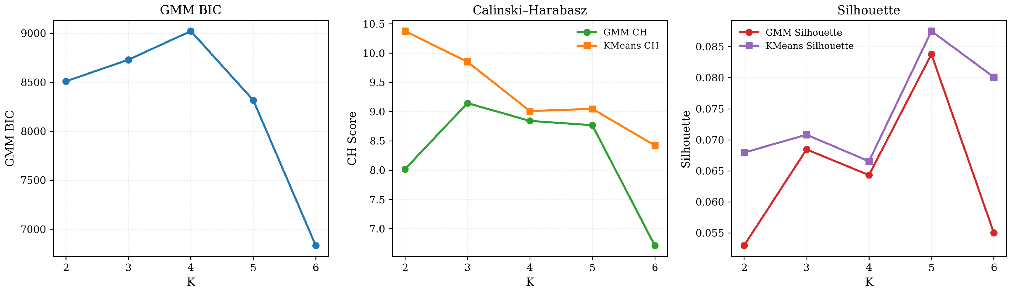| K | BIC | Silhouette Score | CH Score | Combined Score |