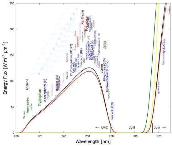The spectrum of UV light available at the Earth’s surface before the origin of life at approximately 3.9 Ga and until at least 2.9 Ga (black and red curves, respectively). The spectrum in the UV-C may even have persisted throughout the entire Archean until 2.5 Ga [16]. Atmospheric CO2, H2O, SO2 and probably some H2S were responsible for the absorption of wavelengths shorter than ∼205 nm, and atmospheric aldehydes (e.g., formaldehyde and acetaldehyde, common photochemical products of CO2 and water) absorbed between about 285 and 305 nm [17,18], approximately corresponding to the UV-B region (280 and 315 nm). By around 2.2 Ga (green curve), UV-C light at Earth’s surface was completely extinguished by oxygen and ozone (which we consider as life-produced UV-C pigments) resulting from organisms performing oxygenic photosynthesis. The yellow curve corresponds to the present surface spectrum. Energy fluxes are for the Sun at the zenith. Over 50 fundamental molecules of life are plotted at their wavelengths of maximum absorption: nucleic acids (black), amino acids (green), fatty acids (violet), sugars (brown), vitamins, co-enzymes and cofactors (blue), and pigments (red). We have asserted that these fundamental molecules were dissipatively structured as UV-C pigments under this light. The font size is roughly proportional to the relative size of the respective molar extinction coefficient of the pigment. Reproduced with permission from Michaelian [19].