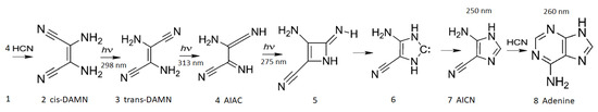 The photochemical synthesis of adenine from five molecules of hydrogen cyanide (HCN) in water, as discovered by Ferris and Orgel (1966) [35,51]. Four molecules of HCN are transformed into the smallest stable oligomer (tetramer) of HCN, known as cis-2,3-diaminomaleonitrile (cis-DAMN) (2), which, under a constant UV-C photon flux, isomerizes into trans-DAMN (3) (diaminofumaronitrile, DAFN). Further conversion on absorbing two more UV-C photons turns it into an imidazole intermediate, 4-amino-1H-imidazole-5-carbonitrile (AICN) (7). Hot ground state thermal reactions with another HCN molecule or its hydrolysis product formamide (or ammonium formate) lead to the purine adenine (8). This is a dissipative structuring process which ends in adenine, a pigment with a large molar extinction coefficient at 260 nm and a peaked conical intersection that promotes the dissipation of photons at the wavelength of maximum intensity of the Archean solar UV-C spectrum (Figure 1). Adapted from Ferris and Orgel (1966) [35].