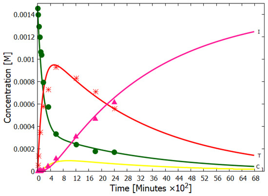 The concentrations of cis-DAMN (C, dark green), trans-DAMN (T, red), AIAC (J, yellow), and AICN (I, dark pink) obtained as a function of time from our simulation of the dissipative structuring of adenine compared with the experimental data points of Koch and Rodehorst (Figure 1 of reference [91]) starting with the same concentration of cis-DAMN as that in the experiment (0.00145 M). Two unmeasured quantum efficiencies and the unknown light intensity of the experiment (giving the time scale) were adjusted to give the best fit. The evolution of the concentration profile is such that the photon dissipation increases over time, a hallmark of molecular dissipative structuring (see Figure 18 of reference [14]), and in accordance with the non-equilibrium thermodynamic imperative. Reproduced with permission from Michaelian [14].