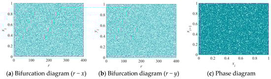 As shown in Figure 3, the 2D-EHM exhibits chaotic behavior over a wide range and demonstrates ergodicity. This indicates that the system not only fills the phase space effectively but also ensures that its trajectory will eventually explore all accessible states, making it suitable for various applications that require robust chaotic characteristics.