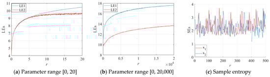 Lyapunov exponents and sample entropy of the 2D-EHM: (a) LEs with a parameter range of [0, 20]; (b) LEs with a parameter range of [0, 20,000]; (c) Sample entropy.