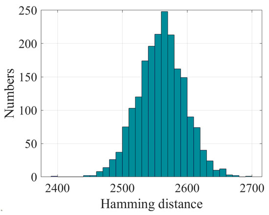 We encrypted a plaintext of length 5120 bits using slightly different keys and calculated the Hamming distance between them. As shown in Figure 7, the results are very close to the ideal value.
