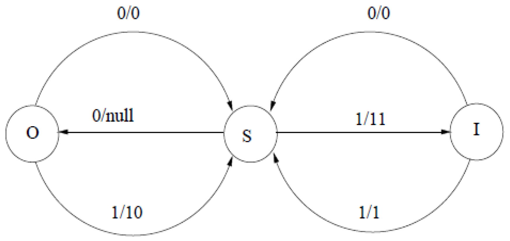 Definition 1. An FS encoder E is called IL if, given any initial state , any positive integer n, and any input string, , the triplet uniquely determines the corresponding input string .