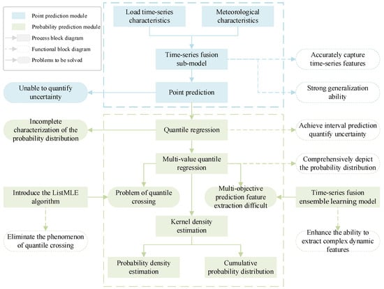 Furthermore, against the backdrop of electricity market reform and competitive regulatory pressures, probabilistic load forecasting demonstrates great practical application value in downstream decision-making to address market uncertainties. High-precision prediction intervals and continuous probability density estimations not only serve the physical security of the power distribution network but also provide market participants, such as power retailers, power generation enterprises, and demand-side response aggregators, with quantified risk boundaries. In modern power markets, this refined uncertainty information directly provides solid data support for strategic scheduling, unit commitment, and day-ahead bidding frameworks. As the power system transitions to a more complex environment, the uncertainty of forecasting fundamentally interacts with the complex network evolution dynamics that drive technological diffusion and strategic adaptation among power enterprises [5]. Based on high-precision probabilistic load forecasting, a deep learning model integrated with game theory can effectively analyze the strategic interactions and dynamic adaptation processes among electricity purchasing and selling enterprises [6], optimize the electricity purchasing and selling behaviors of market entities, and finally achieve economically optimal decision-making in the energy market. For load probabilistic prediction, research can be carried out considering the two aspects of model and method. The methods include probability parameter estimation [7], interval prediction [8,9], and quantile regression [10,11]. Parameter estimation mainly focuses on the statistical characteristics of model parameters, but the information that it provides for load probabilistic prediction is not sufficient. Interval prediction can directly predict upper and lower limit intervals, and its prediction results can provide limits for load fluctuations, but it struggles to provide information on the probability density of the load and the probability distribution. To obtain more load uncertainty information, predicted values and the probability density [12] at different quantile levels can be obtained through quantile regression and kernel density estimation, thereby providing the confidence interval and probability distribution of the load. The model includes a parametric model [13], a data-driven model [14], and a non-parametric model [15]. The probabilistic prediction method, which is based on the parametric model, uses an assumption of the load distribution to predict parameters, and can directly obtain the probability density or cumulative distribution curve of the load based on the model’s output parameters [16]. However, the parametric model relies very much on the rationality of the distribution assumption. In real-world situations, it is unlikely that the load at a certain moment will strictly obey a certain distribution. Data-driven models focus on directly learning load fluctuation changes from data. There is no need to assume data distribution in advance. Their performance depends on data quality and sample size. In Ref. [17], a power load forecasting model named BilineAR-DRTFT is proposed. By introducing a variety of demand response signals and other new engineering features, as well as an improved Bilinear feedforward network, the researchers effectively improve the prediction accuracy of the model. However, in the absence of an adequate data volume, the performance of data-driven models will significantly decrease, and such characteristics are usually more complicated [18]. Non-parametric models do not require a hypothetical distribution of loads, have relatively low requirements for data, have extensive applicability, and have received widespread attention from scholars in China and abroad in recent years. This model is generally built using quantile regression combined with deep learning algorithms. Ref. [19] proposed a load probabilistic prediction method based on quantile regression forest and quantile determination, which can generate multiple-quantile prediction results in parallel, solving the reliability problem of direct prediction intervals when building prediction intervals. To improve the prediction deviation of quantile regression in extremely small and extremely large quantile values, Ref. [20] combined parametric models with non-parametric models to effectively solve this type of problem.