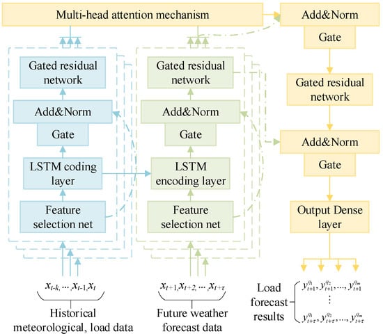 After an input historical timing feature vector is selected through the feature network, the LSTM encoding layer is used as part of the decoding process. This process uses the short-term change features of the load as part of the load prediction decoding layer, and then uses a gated residual network to perform feature extraction of the coded vector. After using the same operation as the one used for the future feature vector, the long-term change information of the load is extracted from the multi-head attention mechanism layer. Short-term change information is extracted, and the short-term change information is integrated with the long-term load change information, which together constitute the fusion of the long-term and short-term timing features in the sub-model.