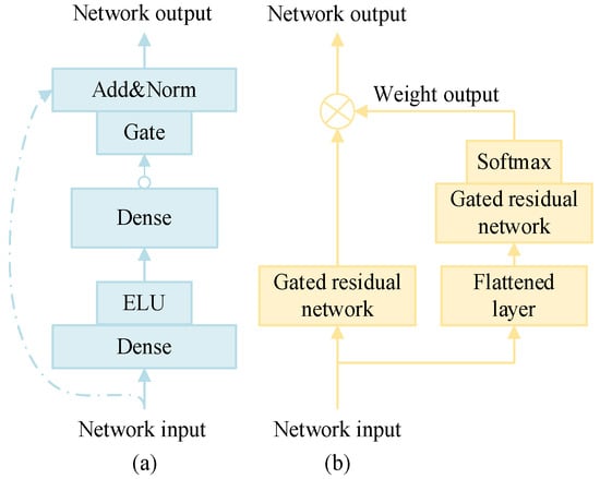 The feature selection network imposes constraints on the model’s input features, aiming to automatically identify and select the most relevant features for load forecasting during the training process. This mechanism reduces redundant information and enhances the model’s generalization capabilities. Compared to a standard fully connected layer, GRN improves feature selection by incorporating gating mechanisms that autonomously determine whether a given feature should be input into the network. This selective process mitigates the impact of irrelevant or redundant features, thereby enhancing generalization performance and reducing computational costs. This structure is illustrated in Figure 4b.