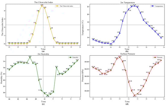 The experimental dataset in this paper uses load electricity data from a 10 kV line in Nanjing City, Jiangsu Province. The load data was acquired from 1 November 2017 to 31 October 2018, with a collection interval of 15 min. The corresponding meteorological data comes from the NASA Surface Meteorology and Solar Energy Dataset, including ultraviolet radiation exposure index, temperature, humidity and air pressure, etc., with a collection interval of 15 min. The models used in this article are all built on the Keras and Tensorflow deep learning platforms in Python 3.11.7. Figure 6 shows the meteorological data of a sample day.