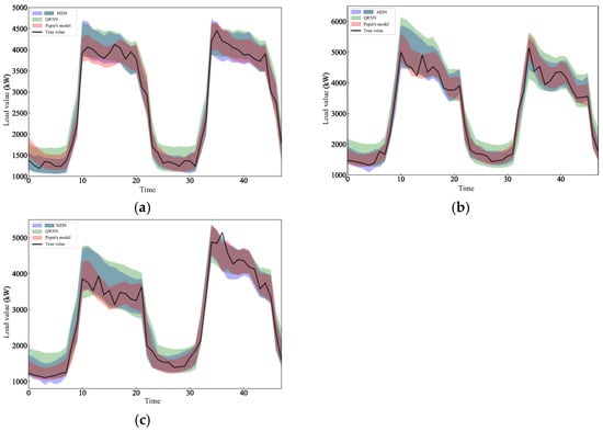 The CRPS index was used to further compare the overall probabilistic prediction performance between different models on holidays. The smaller the value, the more reasonable the prediction result of the multi-value quantile model, as shown in Table 8. From the indexes of the QRNJ model and TFL model, we can see the advantages of the sorting constraint of maximum likelihood estimation and the intertemporal sequence fusion model. Moreover, by constructing the integrated learning model, the paper’s model achieves the optimal prediction result, which is slightly worse than the parametric MDN model (74.902) only for the prediction of holiday loads (75.303). However, the proposed model is obviously superior to the MDN model for load forecasting for other day types.
