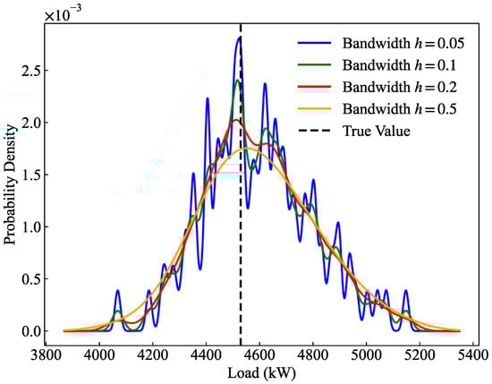 The fourth part of the model was to convert the discrete quantile prediction value into a continuous probability density curve through the kernel density estimation method [28]. The kernel density estimation calculation is shown in Equation (22), and then the continuous probability distribution curve was obtained through the approximate integral algorithm as the prediction result of the load probabilistic prediction model.